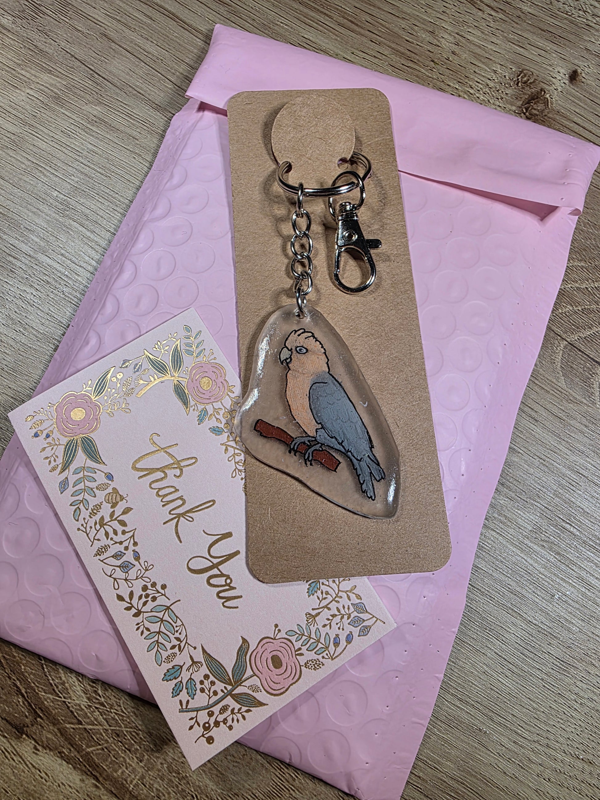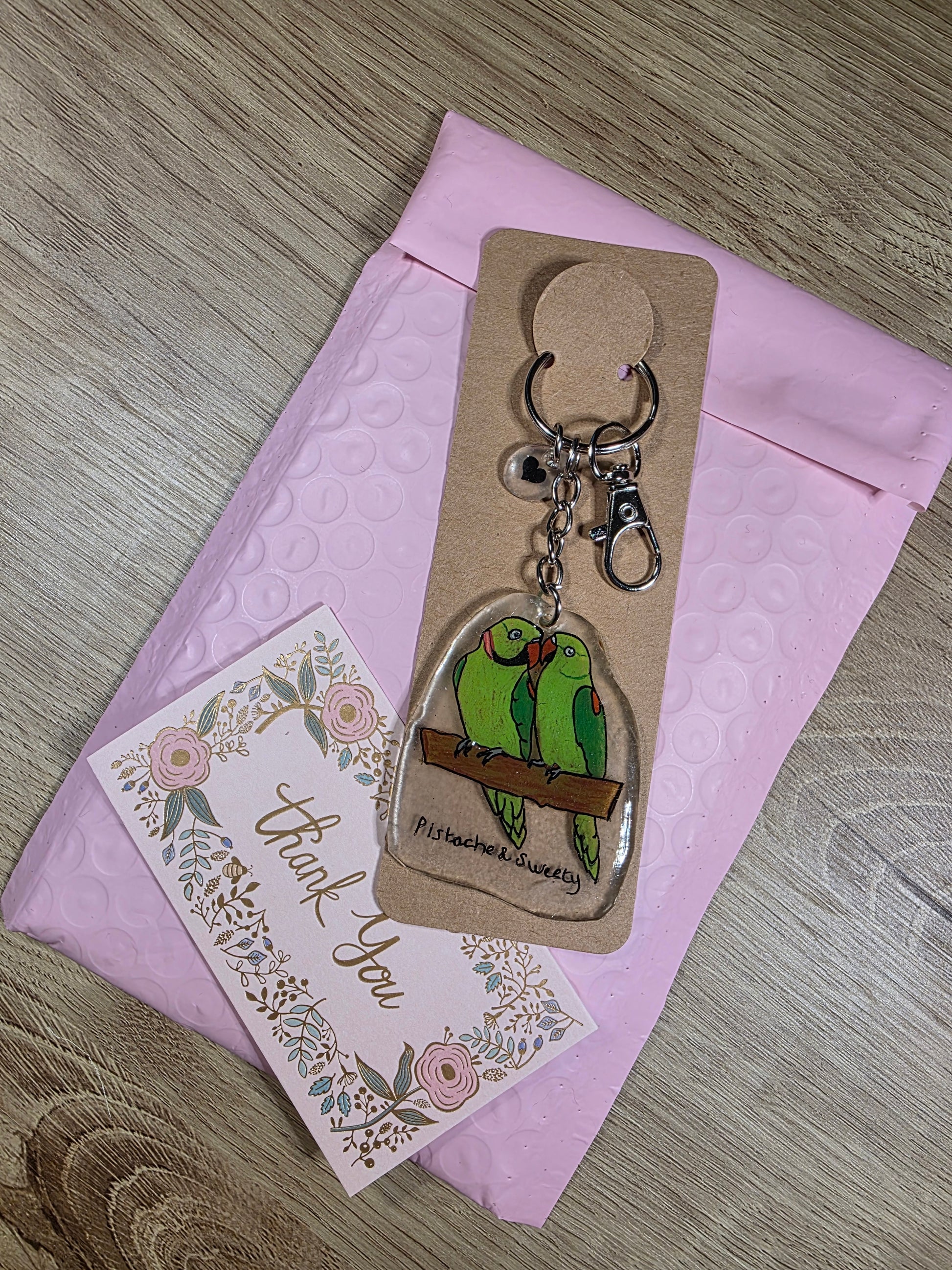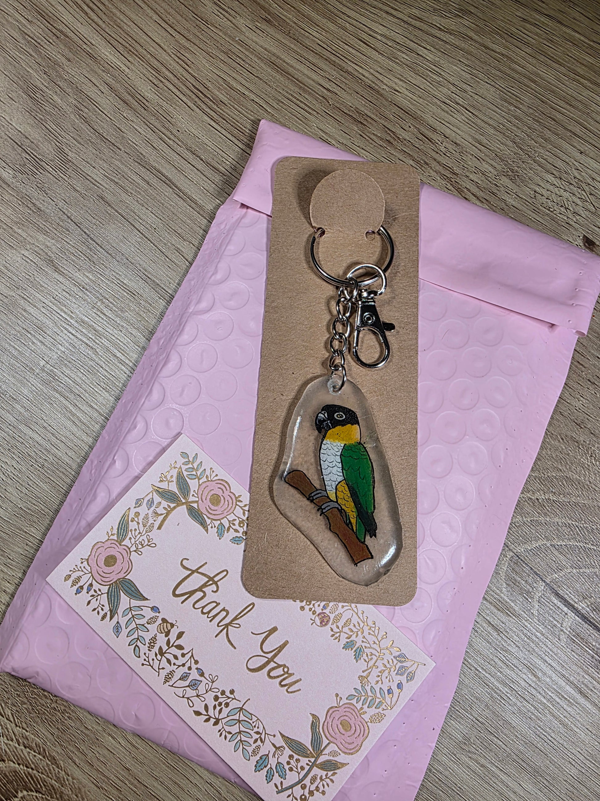 Chaque porte-clé est entièrement artisanal : je dessine, je colorie, je vernis et je protège avec de la résine.